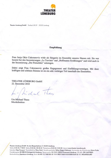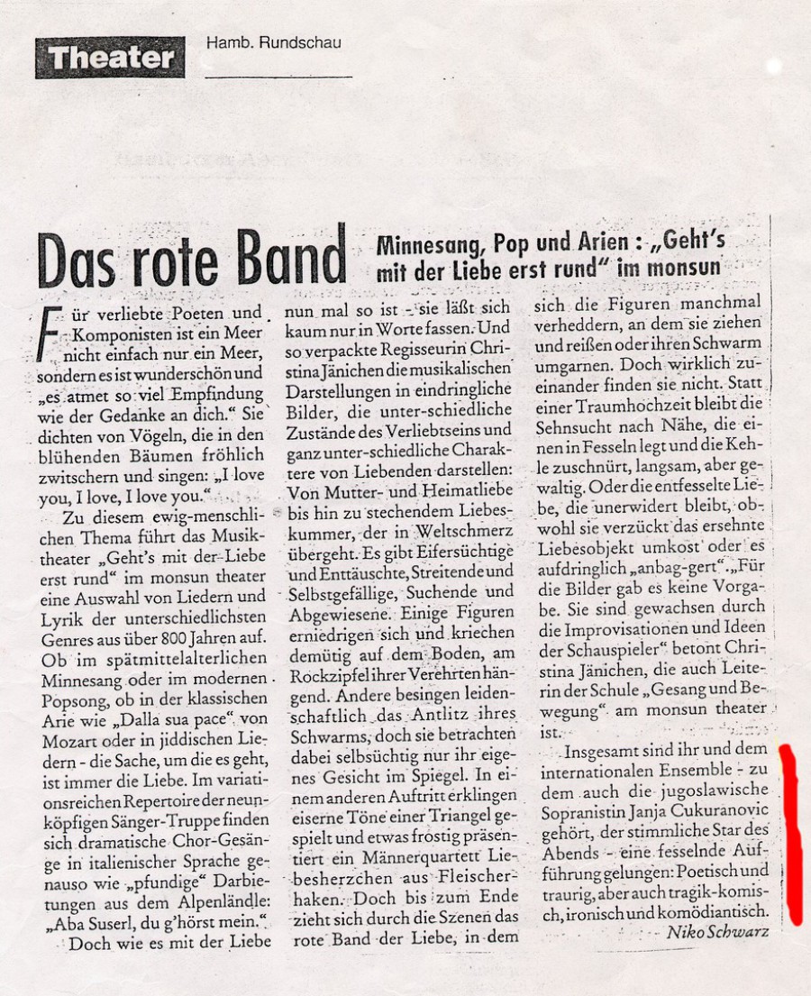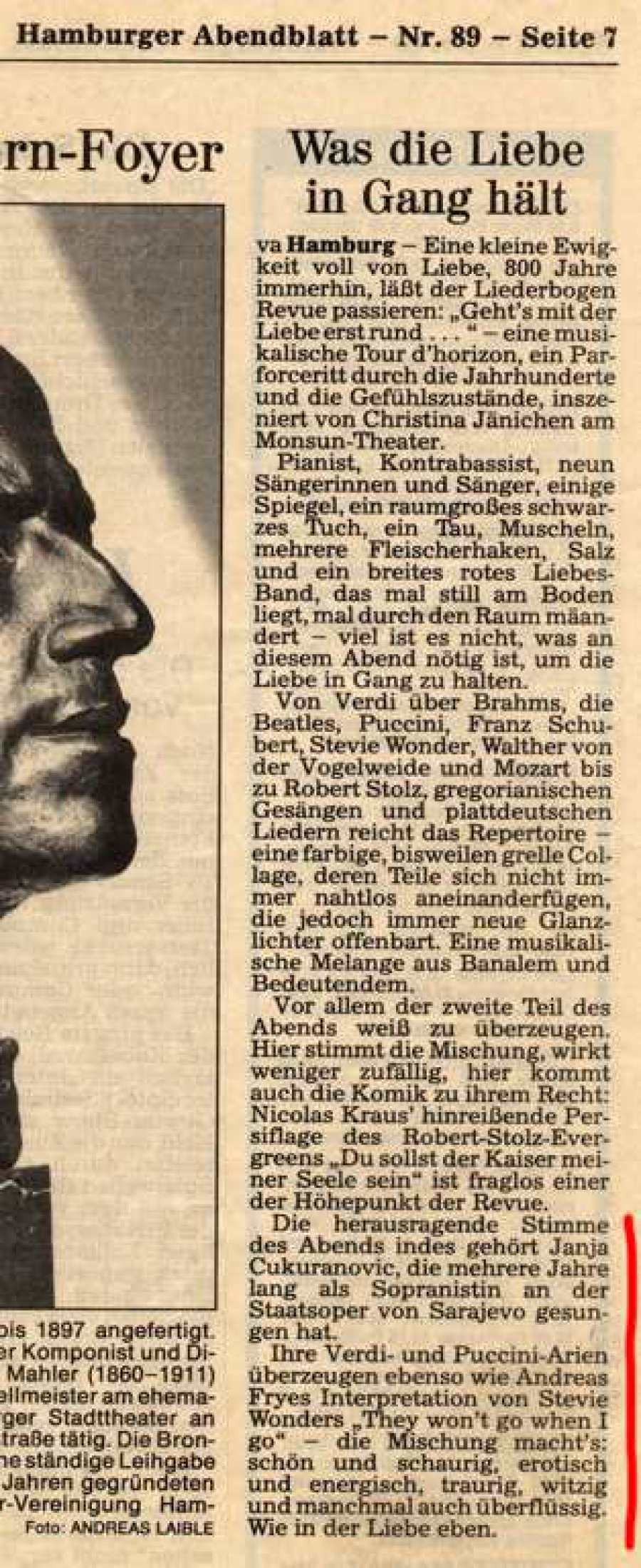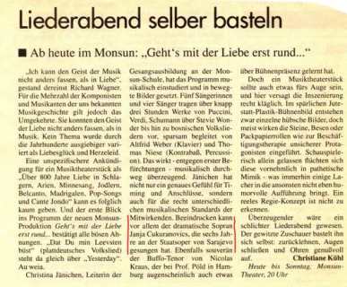 " Insgesamt ihr und dem internationalen Ensemble - zu dem auch jugoslawische Sopranistin Janja Okic Cukuranovic gehört, der stimmliche Star des Abends - eine feselnde Aufführung gelungen : Poetisch und traurig, aber auch tragik-komisch, ironisch und komödianisch."