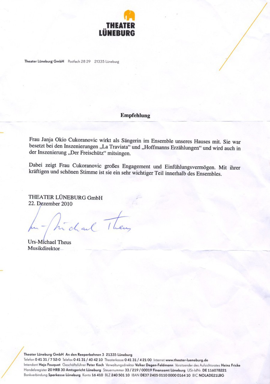 " Frau Janja Okic Cukuranovic wirkt als Sängerin in Ensemble unseres Hauses mit. Sie war besetzt bei den " La Traviata" und " Hoffmanns Erzählungen" und wird auch in der Inszenierung " Der Freischütz" mitsingen.